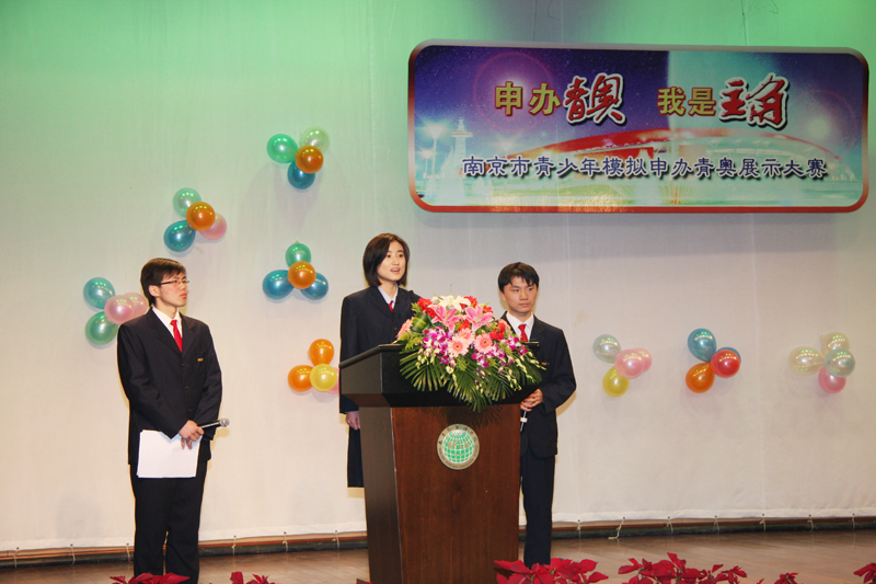 | 比赛开始之前,团市委副书记郑玲玲致辞。郑书记希望同学们以“永远争第一”的信念,赛出风格,赛出水平,向全国、全世界青少年展示南京市青少年的精神风貌,为南京申办青奥加油。 比赛分为申办陈述环节、DV展示环节和互动提问环节三部分。选手们从南京优秀的历史文化传统、优美的人居自然环境、优良的城市人文素质、优异的体育竞技成绩等各个方面,以青少年视野,为南京申办青奥进行了陈述,并展示了同学们自己动手制作的各具特色的DV。 此次比赛我校选出高三年级的陈乾、智奥亮和高澍雨三位同学,他们分别模拟南京市市长、国家奥委会官员和青少年形象大使,在比赛中用英语进行申办陈述,高一和高二年级的部分同学组成亲友团观摩此次比赛并为我校选手助威加油,校园电视台热情参与并制作了参赛DV。同学们通力合作,发挥各自的优势,在比赛中赢得现场评委和观众的一致好评。经过紧张角逐, 我校和金陵中学、江苏教院附中代表队等3个代表队获得一等奖,同时还获得了最佳陈述代表队、最佳DV制作代表队2个单项奖。 比赛后,金陵职教中心的藏族青少年朋友们现场为观众们表演《青春踢踏》,向南京市青少年展示了藏族青少年们用汉、藏两文字签名的参与、支持南京申办青奥的祝愿。 模拟申青奥比赛,让青少年亲身参与申办青奥,增强了百万青少年对于“让奥运走进青年,让青年拥抱奥运”申青奥理念的理解和认同,表达了对2014年第二届青奥会的热烈期盼。 |