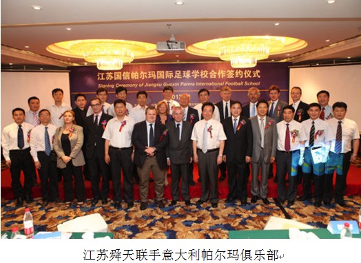 6月23日下午,江苏省国信集团、意大利帕尔玛足球俱乐部、江苏省体育局和共同在北京举办了江苏国信帕尔玛国际足球学校的签字仪式。在新闻发布会上,江苏国信集团副总经理徐祖坚,意大利帕尔玛足球俱乐部主席吉拉尔迪,江苏体育局所属的江苏苏体有限公司董事长顾晔和副校长王瑞卿分别代表合作四方签署了合作协议。