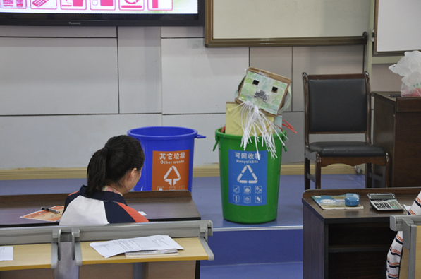 在优美的音乐伴奏下,各组模特身着自己设计制作的服装在教室中走秀,组长向大家说明服装所用材料及寓意。所有组展示结束后,5名观众评委进行评比打分,评出综合奖、单项奖若干。比赛结束后,老师又带着大家对部分服装拆分处理——垃圾分类,这一过程旨在使学生懂得节约利用和保护资源的重要性,并能够付诸行动。