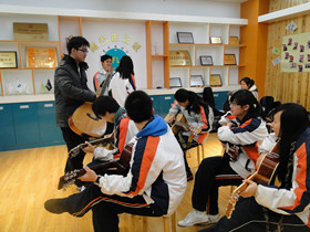作为社长,我先是找到前社长和乐队吉他手还有高二的几位吉他好手,成功组成了教学团队。然后又安排高一的年级负责人向社员宣传这项活动并同时接受报名。很快第一次活动的日子到了,参与的有八、九位同学,我们很是欣喜。虽然社员的吉他水平参差不一,但是我们是早有准备。对于入门级,由我们乐队的吉他手高然同学从指法、和铉开始教起,一遍一遍反复练习,并一一指导过关;对于在吉他上略有成果的同学,我们则安排了一对一的交流,从最近练习的吉他谱开始,相互切磋学习。吉他虽然有趣,可是艰苦的学习道路难免有些枯燥,我们就有针对性的安排了一些有意思的表演和展示。比如第一次活动时前社长弹唱并略加创作的小曲引得全场捧腹大笑,再来我们还带了特殊工艺制作的小四弦琴给大家上手把玩。