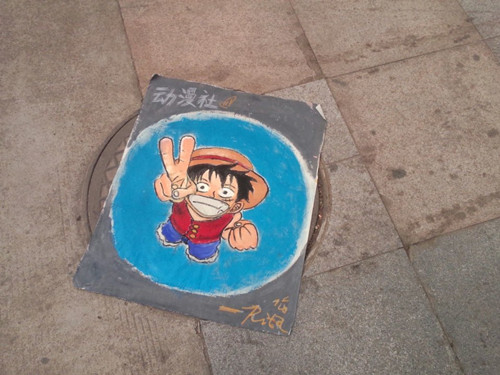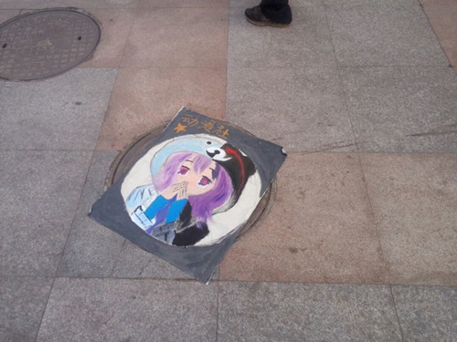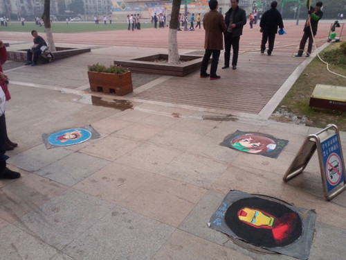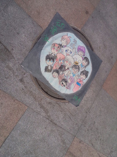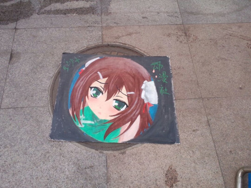 在上学期末的时候,我有幸参加了动漫社组织的绘画窨井盖活动。由于校园内的窨井盖都是公共财产不能随意涂画,所以我们选择了把布裁剪成同样的大小进行创作,最后将画布铺在窨井盖上展览的方法。