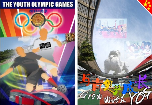第一张海报以奥体中心为背景。下方写着中英文的南京青奥会口号“与青奥共成长”。