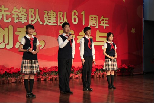 今天,我们在这里隆重集会,举行 “纪念中国少年先锋队建队61周年暨‘青奥,我创意,我参与’主题队日活动。