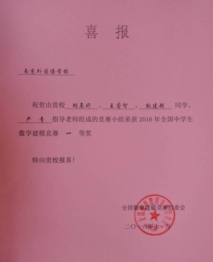 2016年8月16日—8月18日,我校高二(1)耿建超、高二(3)班胡辰妤和高三(2)王睿智组队参加了2016年全国中学生数学建模竞赛(国华大学堂杯),并获得了一等奖的好成绩。