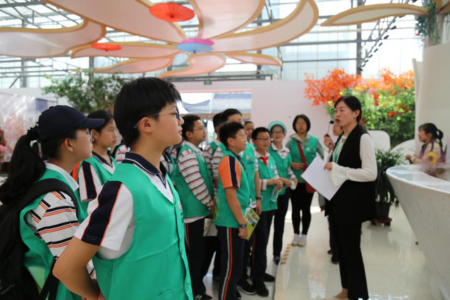 抵达园区后,映入眼帘的是独具特色农业嘉年华展馆,传统文化与现代科技相结合。跟随着导游的步伐,孩子们参观了农业嘉年华主展厅、创意农业馆、农业科普馆、友谊馆、台湾馆等,感受到了场馆内农业生产、农民生活、农村生态和农业观光的科学规划和系统创意。