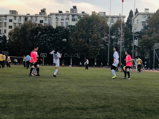 随着一声哨响,由十三中开球发起进攻。南外积极盯防,轻松化解了十三中的第一轮攻势,球权交换。本场位置后撤的庄子青在我方半场拿球组织进攻,和下底拉边的袁榕形成直接连线,成功地打出了一波又一波有组织的进攻,几次对对方球门造成了威胁。比赛进行到十四分钟,吴昱璇前场就地反抢后发起进攻,一记长传破使对方门将出击犯规,南外获得了一个位置极佳的任意球机会。庄子青主罚任意球,十三中四名球员都站在了门线上,将本就不大的球门堵的严严实实,依然挡不住庄子青势如破竹的射门,足球划出了一记优美的弧线落入死角,球进了!南外1:0十三中。我方士气大增,而十三中先丢一球,显得有些急躁,双方在拼抢过程中,吴昱璇摔倒在地。受伤的吴昱璇被仝教练换下场稍作调整,换上杨若曦。刚刚上场的杨若曦由于个人原因没能参加上一场比赛,本轮状态生猛,凭借速度优势快速回防,在禁区边缘成功破坏了十三中24号的单刀球。上半场接近尾声,史珂菡在一次拼抢中脚踝受伤,被迫下场,又换回了休息完毕的吴昱璇。本场史珂菡完美的执行了战术任务,凭借身体优势和精准的卡位,极大程度限制了十三中核心15号的发挥,将掌声送给史珂菡,也希望她快点康复。经过一番阵地战,上半场结束,南外带着一球优势开始了休息与战术讨论。
