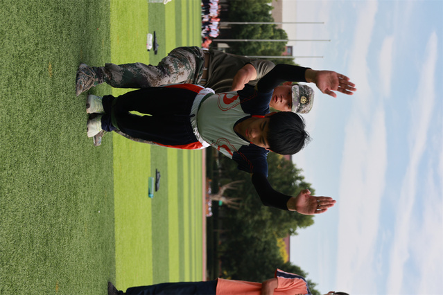 “一二一、一二一”、“拼搏青春、一往无前!”训练场上,响彻着各连队精神饱满的喊声。走直步时前面的手臂要成45度,后面的手臂要伸得尽量高,同学们按照教官的要求,精准控制着自己的摆臂动作;踢正步时整个连队要一起落脚,步调一致声音才会整齐,同学们练习了一遍又一遍,终于形成了默契,气宇轩昂,体会到了军人的感觉;喊口号时要有气势、有魄力,于是同学们学习用腹发力,把口号喊得声势浩大,显出排山倒海之势。“嘿、嘿哈嘿…哈、杀!”男女生军体拳的同学们轻如飞燕、猛如霹雷。出拳、劈掌、侧踢…一个个动作行云流水、刚劲有力。