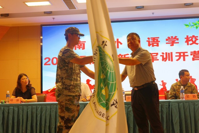张玉东校长向军训部队授校旗,教官代表接旗。