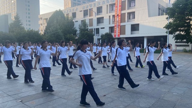 在午休与略显忙乱的内务整理过后,女拳方阵再一次在烈日曝晒下整齐地排列在训练场上。首先进行的是前5招的复习,随后又继续学习了第6至第9招,其中有数“招”内含多“式”。这对于动作加快就容易手忙脚乱的我而言有些困难。幸运的是,在经验丰富的教官的指导下,我与女拳方阵其他成员的动作得以整齐划一。